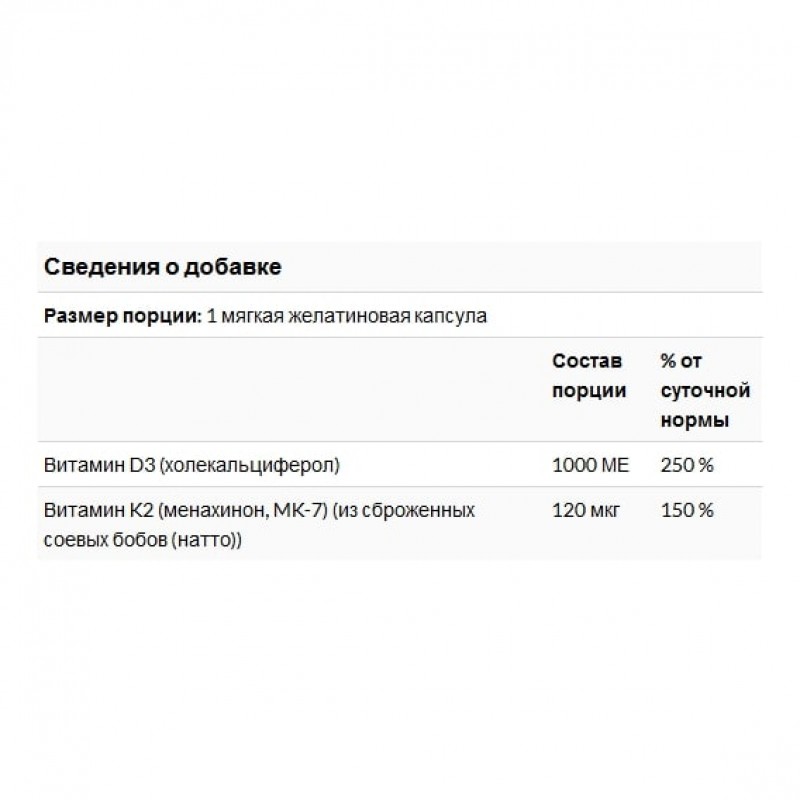 Сочетание витаминов D и K может быть более полезным для здоровья костей и сосудов, чем их прием по отдельности. Содержит биоактивные формы D3 и MK-7 с высокой биодоступностью.