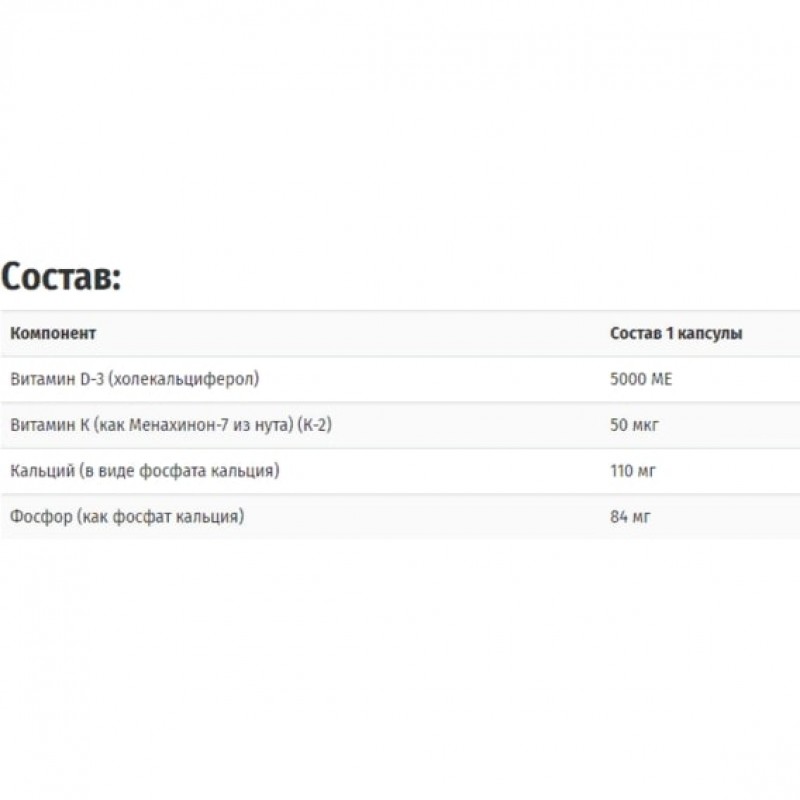 Витамины D3 и К2 (Vitamin D-3 and K-2) препятствуют вымыванию кальция из костей, предупреждают слабость мускулов, повышает иммунитет, нормализует функцию щитовидной железы и свертываемость крови, участвует в регуляции артериального давления и сокращения сердечной мышцы.