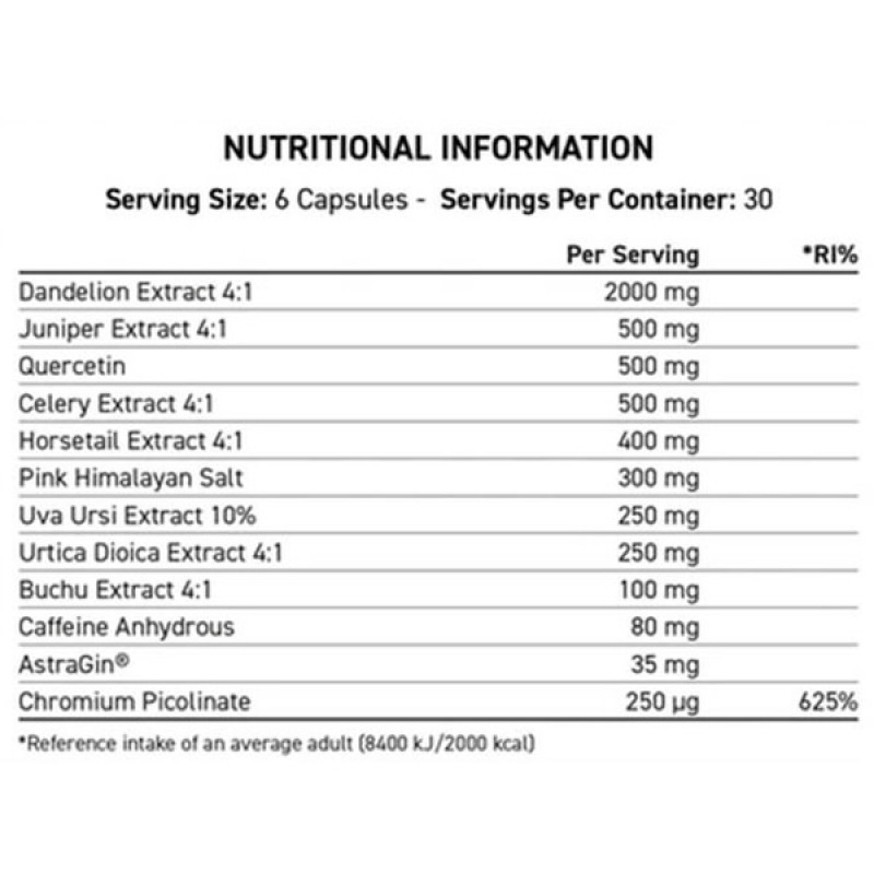 Одуванчика экстракт (одуванчик), экстракт можжевельника (Можжевельник обыкновенный), кверцетин, сельдерей экстракт семян (сельдерея черешкового), экстракт хвоща (хвощ), Гималайская розовая соль, Ува экстракт толокнянки (Arctostaphylos ува-урси), экстракт корня крапивы (Крапива двудомная), экстракт листьев бучу (agathosma бетулина), кофеин безводный, Астрагин® (экстракт женьшеня Panax Notoginseng, астрагала перепончатого), хрома Пиколинат. Другие ингредиенты: Растительная Оболочка капсулы (Гидроксипропилметилцеллюлоза, Растительный Стеарат Магния, Диоксид Кремния).