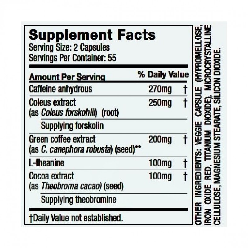 Содержит научно разработанные и протестированные ключевые ингредиенты: 250 мг Coleus Forskohlii. А также 56.3 мг йохимбе, 200 мг Canephora Robusta и 100 мг L-Theanine.