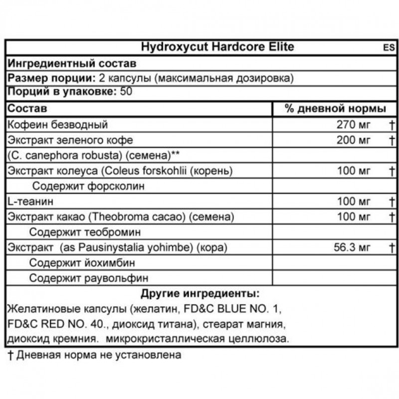 Hydroxycut Hardcore Elite так же содержит мощный супер-термогенный компонент - безводный кофеин (caffeine anhydrous) который обеспечит вас взрывной энергией с одного приема!