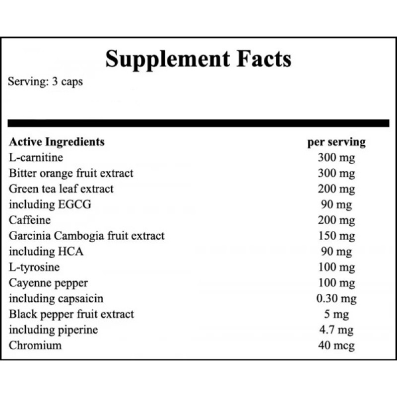 L-Carnitine осуществляет транспорт жирных кислот, которые разрушаются, что сопровождается выделением энергии. Экстракт горького апельсина и тирозин ускоряют обмен веществ в организме, экстракт зеленого чая и кофеин наделяют энергией и повышают выносливость, перец является термогеником.