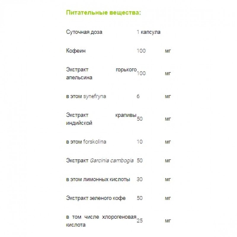 Экстракт горького апельсина - содержит синефрен-алкаид, благодаря которому увеличивается выработка тепла в организме (термогенез) и количество сжигаемых калорий.