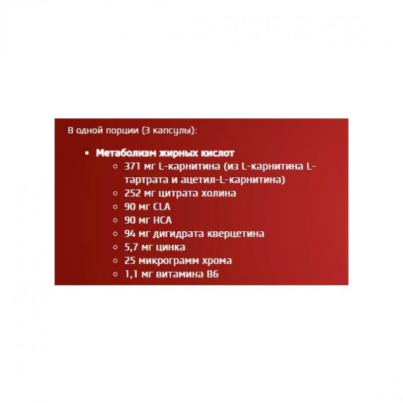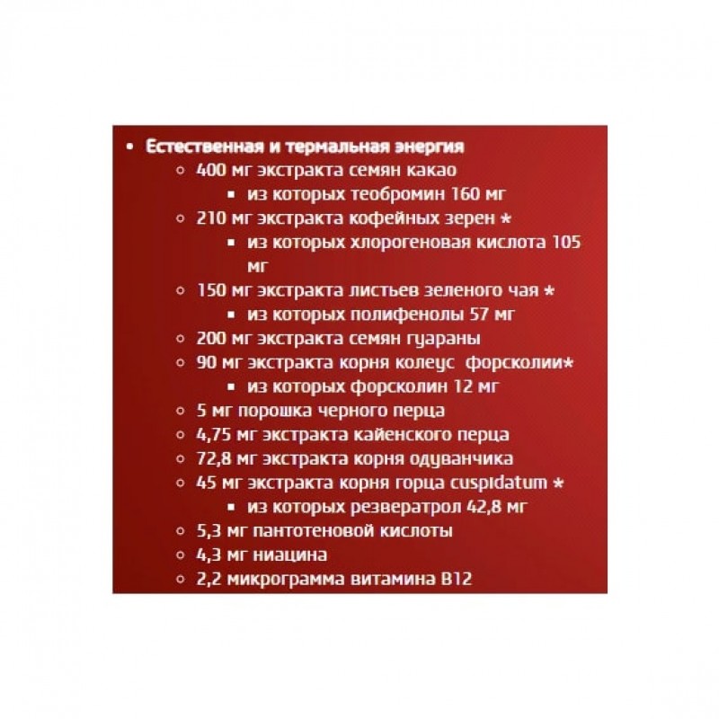 В витаминно-минеральном комплексе, служащем основой продукта Black Burn, имеются также такие популярные ингредиенты, как L - карнитин, L-тирозин, CLA, HCA или инозитол. Среди разнообразных ингредиентов данного продукта имеется 11 растительных экстрактов, таких как кайенский перец, черный перец, корень колеуса форсколии, лист зеленого чая, зеленый кофе и гуарана. Последние 3 растительных экстракта также служат естественными источниками кофеина, но помимо этого мы также обогатили его добавлением безводного кофеина для повышения динамики ваших тренировок.