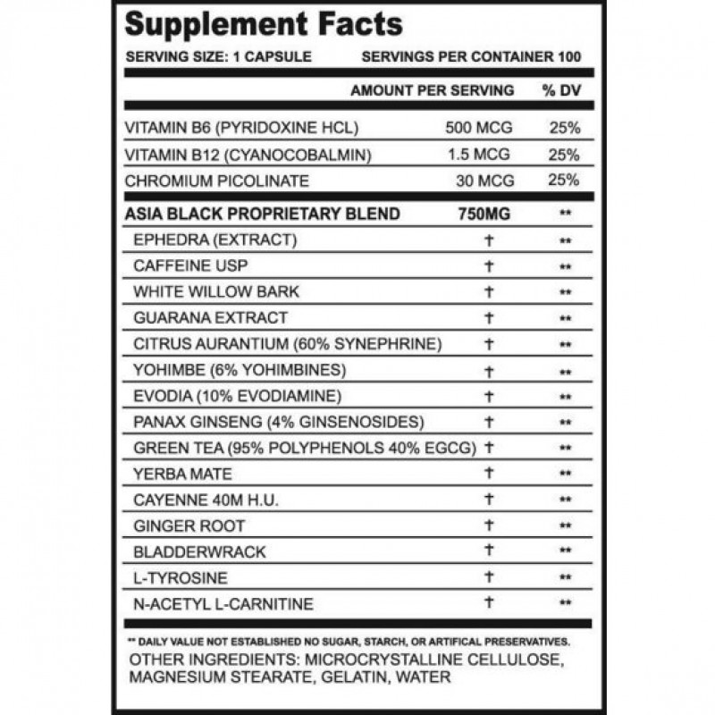 Asia Black Cloma Pharma – комплекс эфедра – кофеин – аспирин, усиленный большим количеством компонентов-синергистов, таких как экстракты зеленого чая, коры белой ивы, гуараны, йохимбин, L-карнитин, L-тирозин, Cayenne, пиколинат хрома и некоторые другие. ЭКА – самый мощный активатор расщепления жиров, оказывающий на ЦНС и соматическую нервную систему стимулирующее действие, ускоряющий жировой метаболизм и проявляющий термогенные свойства. Он усиливает секрецию гормонов стресса адреналина и норадреналина, что разрушают жировые отложения и препятствуют образованию на их месте новых; подавляет аппетит; повышает мотивацию на тренировке.