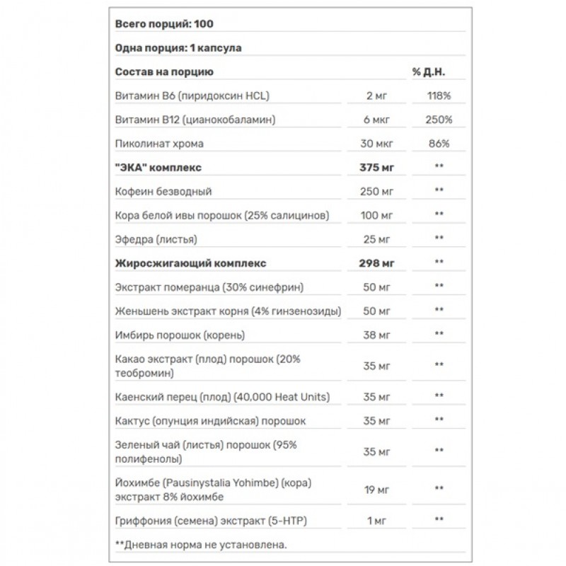 Данная добавка является источником кофеина, аспирина и эфедры. Каждый компонент влияет на процессы метаболизма. Кофеин является термогеником и метаболиком, он стимулирует производство адреналина, способствует ускорению обмена веществ в организме, влияет на повышение температуры тела, в условиях которой происходит активное расщепление жиров и увеличивается концентрация гормона адреналина, который запускает механизм окисления жиров (липолиза).