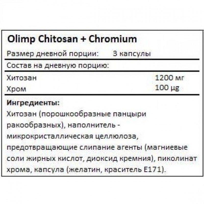 Chitosan + chromium от Olimp – это уникальный продукт, который был создан в виде капсул. В данном продукте содержатся два очень важных ингредиента – хитозан и хром. Хитозан – это полезное волокно, которое было выделено из панциря рака. Данный компонент отличается хорошей усвояемостью. Он поддерживает иммунную систему и способствует хорошей работе мозга. Также хитозан выводит из организма лишние жиры и не дает им усваиваться в организме. Хром – это полезный компонент, который отвечает за нормализацию процесса обмена веществ и регулирует количество глюкозы в крови человека. Chitosan + chromium от Olimp очень полезный продукт, который способствует хорошему очищению кишечного тракта.