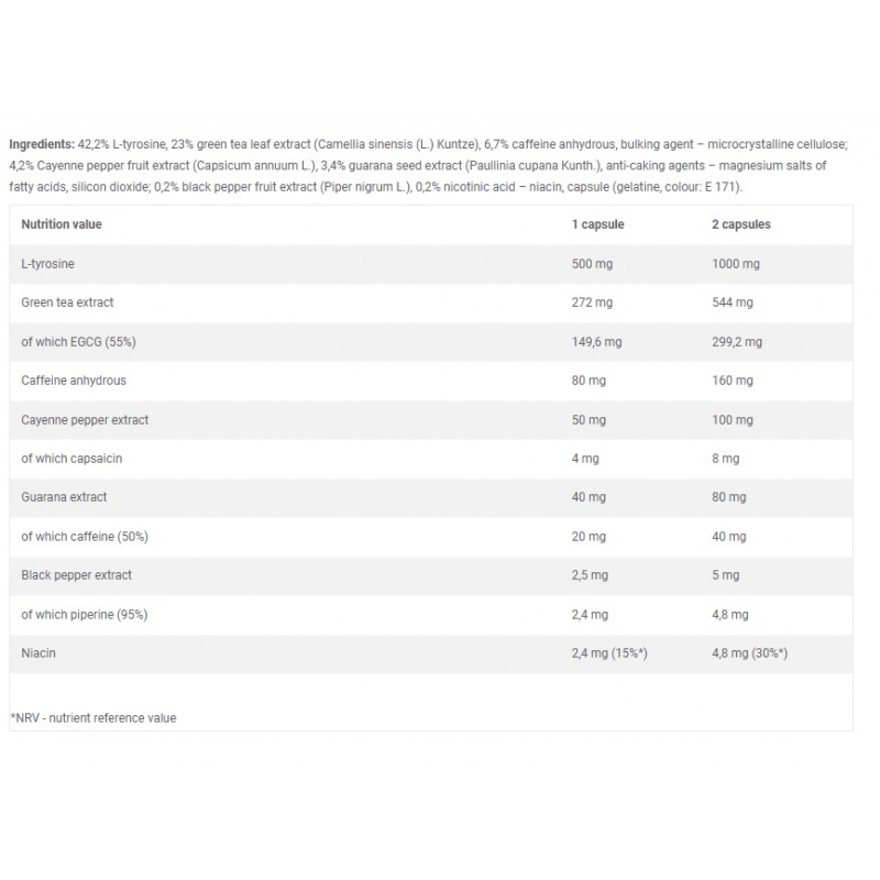42,2% L-тирозин, 23% экстракт зеленого чая, 6,7% безводный кофеин, микрокристаллическая целлюлоза, 4,2% экстракт кайенского перца, 3,4% экстракт гуараны, магниевые соли жирных кислот, диоксид кремния, 0,2% экстракт черного перца, 0,2% никотиновая кислота - ниацин, желатин, краситель.