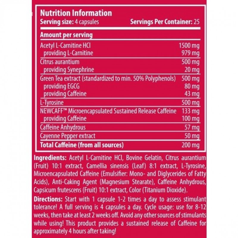 В состав входит L-карнитин и не только обычный L-карнитин, но и более сложный ацетил L-карнитин (ALC) в таких колоссальных дозах — что вы вероятно не захотите взять карнитин отдельно. И при этом TURBO RIPPER предоставляет много других ингредиентов в одной порции: богатый катехином экстракт зеленого чая; тирозин, который является предшественником многих важных гормонов и нейротрансмиттеров; экстракт горького апельсина стандартизированый по синефрину. Кроме того, TURBO RIPPER дает серьезный кофеиновый заряд - 200 миллиграммов на порцию из различных источников, в том числе микрокапсулированного, с замедленным высвобождением кофеина! Это новая система усвоения кофеина, которая высвобождает кофеин в течение примерно 4 часов.