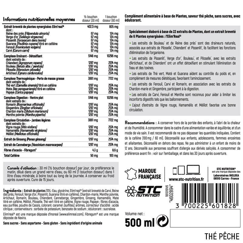 Ингредиенты: водноглицериновые растительные экстракты 70%: очищенная вода, растительный глицерин, Elim'real®** (запатентованный экстракт тмина, таволги, фенхеля, золотарника, одуванчика, гуараны титрованной в кофеин), расторопша, мята перечная, береза, пырей, клюква, имбирь, женьшень, гамамелис, мате титрованный в кофеин, донник, ястребинка, зеленый чай титрованный в кофеин, красная лоза, папайя; волокна акации, очищенная вода, натуральный концентрат черной смородины, натуральный краситель: карамель (сульфиты), натуральная арома, регулятор кислотности: лимонная кислота, консерванты: сорбат калия, бензоат натрия, подсластитель: сукралоза.