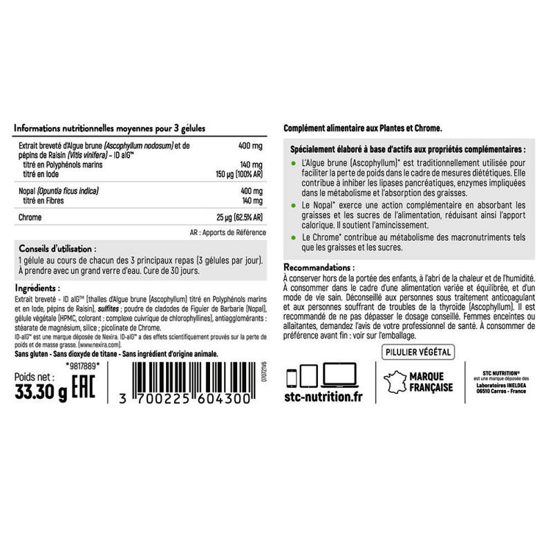 ID-alG™ – это запатентованный 100% натуральный активный ингредиент, сочетающий экстракт бурой морской водоросли Ascophyllum с экстрактом виноградной косточки. Эксклюзивный состав полифенолов морского происхождения позволяет ингибировать амилазу и липазу более чем на 50%, два фермента, ответственные за усвоение жиров и углеводов.
