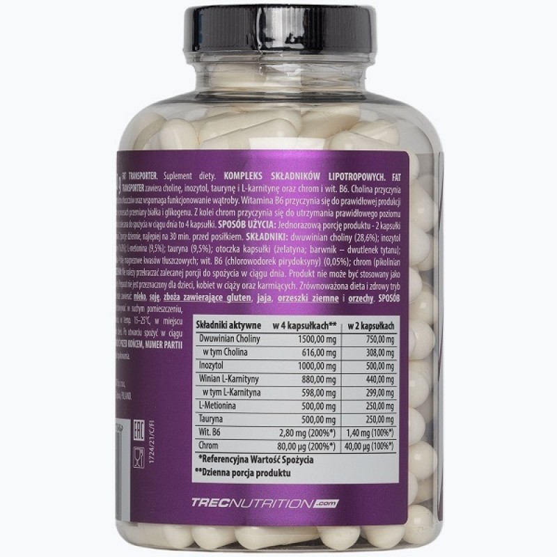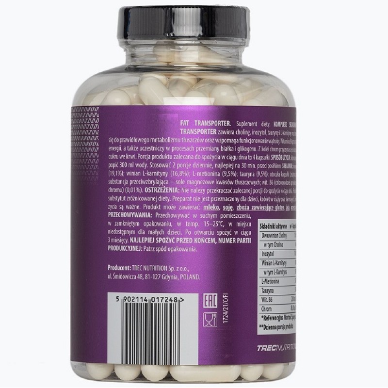 Trec Fat Transporter — это биологически активная добавка, представляет собой комплекс липотропных ингредиентов, которые активизируют метаболизм жиров в организме. Особый состав холина, инозитола, таурина и L-карнитина способствует переработка, плавлению и транспортировке молекул жира. Благодаря своим эмульгирующим свойствам эти вещества снижают уровень вредного холестерина и очищают стенки сосудов от жировых отложений. Они останавливают развитие атеросклероза, а также укрепляют сердечную мышцу. Витамин В6 ускоряет обмен веществ, а хром стабилизирует метаболизм сахаров в организме, при этом подавляя аппетит.