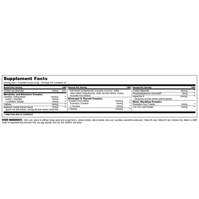 Комплекс щитовидной железы 350 мг, L-тирозин 245 мг, Экстракт оливковых листьев 100 м,г Шалфей лекарственный 5 м,г Водоотводящий комплекс 800 мг, Одуванчик 350 мг, Хрен 350 мг, Корень на липучке 25 м, Лист бучу 25 м,г Можжевельник 25 мг, Семена сельдерея 25 мг, Ноотропный комплекс 500 мг, Готу кола 225 мг, Битартрат холина 225 мг, Бакопа Монниера 50 мг, Комплекс ингибированного кортизола 300 мг, Экстракт корня ашваганды 223 мг, anax Ginseng (красный) 75 м,г Фосфатидилсерин 1,5 мг, Кора магнолии (экстракт) 0,5 мг, CCK Boosting Complex 300 мг, Шелуха подорожника 300 мг, Пектин яблочный 0,5 мг, Корица (кора) 0,5 мг, Комплекс биодоступности 500 мг, Корень имбиря 220 мг, Кайенский перец (фрукты) 170 мг, Грейпфрут (6,7 дигидроксибергамоттин) (кожура) 59,5 мг, Кверцетин 25 мг, Нарингин (цитрус) 25 мг, Черный перец (экстракт) 0,5 мг,