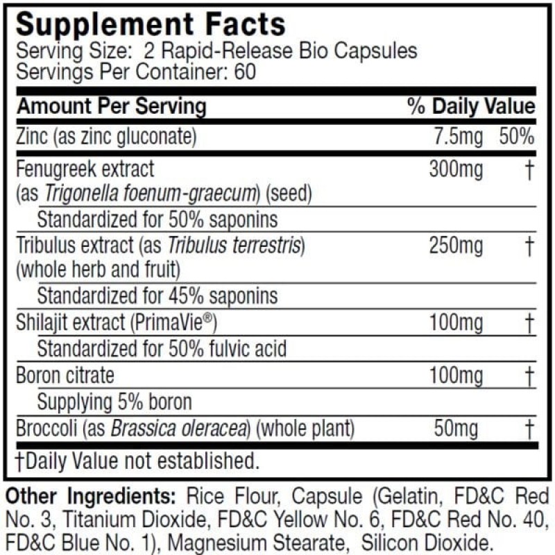 Эта формула содержит пажитник, стандартизованный до 50% сапонинов, что позволяет вам в полной мере использовать его преимущества. Формула также содержит порошок брокколи, источник дииндолилметана (DIM), еще одного соединения, важного для поддержания уровня тестостерона.