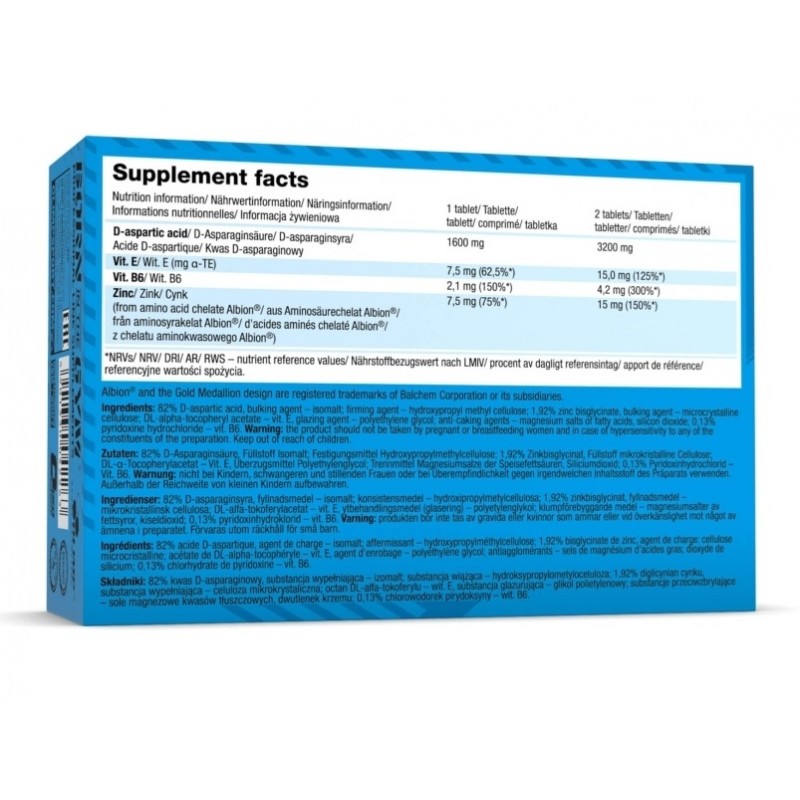 82% D-аспарагиновая кислота, наполнитель - изомальт; укрепляющий агент - гидроксипропилметилцеллюлоза; бисглицинат цинк, DL-альфа-токоферола ацетат - вит. E, агент остекления - полиэтиленгликоль; агент, предотвращающий слипание - магниевые соли жирных кислот, пиридоксина гидрохлорида - Вит. В6