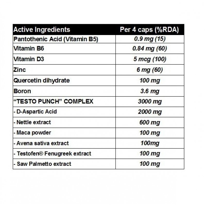 D-аспарагиновая кислота, бычий желатин, экстракт Urtica dioica (лист) 10: 1, экстракт Avena sativa (семена) 5: 1 ( овес ), порошок Lepidium meyenii (корень), кверцетин, извлеченный из почки Sophora japonica (84%), сереноа repens (Fruit) 12: 1 экстракт, Testofen® Trigonella foenum-graecum (семена), экстракт (50% Fenuside ™), анти-слеживающий агент (стеарат магния), борная кислота, моногидрат сульфата цинка, цвет (диоксид титана), холекальциферол, D-пантотенат кальция, пиридоксин HCl