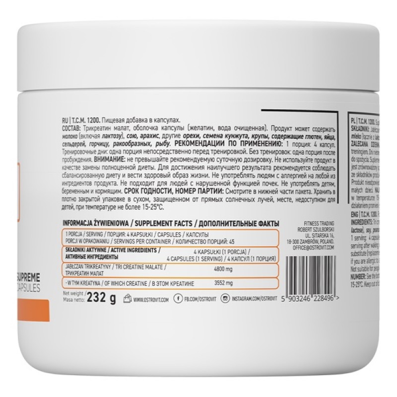 TCM 1200 от польского производителя Ostrovit – высокоочищенный креатин в мягких гелевых капсулах. Основной нутриент в этой биоактивной добавке представлен в форме трикреатина малата – сочетания трех молекул чистого креатина и одной молекулы яблочной кислоты. Такая форма обеспечивает высокую усвояемость компонента, а значит, позволяет получать от приема продукта максимум пользы.