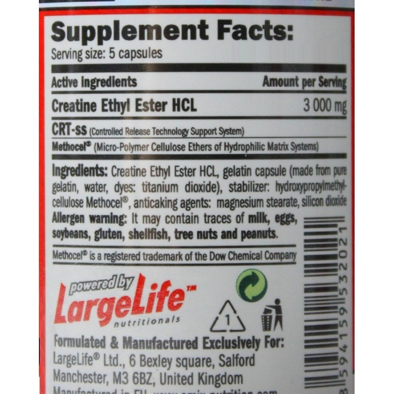 Creatine Ethyl Ester HCL (CEE) представляет собой моногидрат креатина с присоединенным эфиром. Сложные эфиры – это органические соединения, которые образуются в результате этерификации – реакции карбоновой кислоты и спиртов. С помощью этилового эфира креатина, молекулы легко транспортируются через липидный (жировой) слой мембраны кишечника и мышц, способствуя лучшему всасыванию. Скорость абсорбции при этом превосходит любую другую форму креатина.