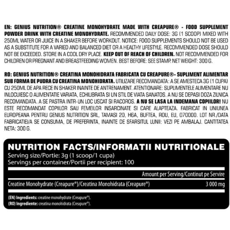 Креатин Genius Nutrition® – на 100% чистый продукт для поддержания и роста мышечной массы, способствует увеличению силы и ускоренному восстановлению. Прием креатина поможет повысить энергетический потенциал организма во время интенсивных тренировок.