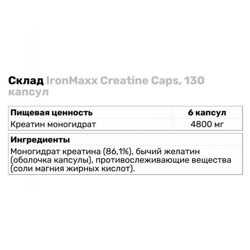 В капсулах IRONMAXX CREATIN содержится креатин – карбоновая кислота, необходимая для нормального функционирования мышц и нервных клеток.