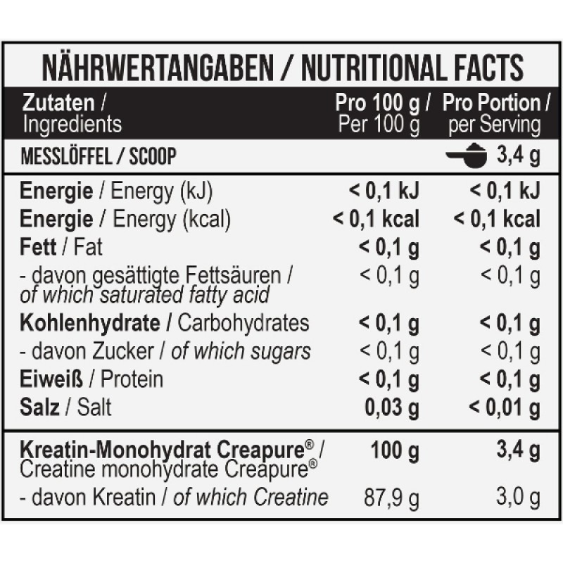 Продукт, имеющий логотип Creapure® на упаковке, гарантирует, что это чистый и лучший моногидрат креатина, сделанный в Германии.