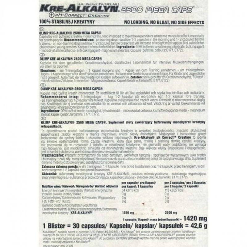 Креатин Olimp Kre-Alkalyn 2500 Mega Caps является современный препарат, который пользуется хорошей популярностью у спортсменов, ведь он позволяет значительно улучшить свои результаты. Olimp Kre-Alkalyn 2500 Mega Caps выпускается в удобной для приема капсулированной форме, хорошо и быстро усваивается без опасности побочных эффектов. Он начинает действовать достаточно быстро, при этом сохраняет свой эффект на протяжении большого промежутка времени. С таким помощником намного легче добиться большого объема мышц. С Olimp Kre-Alkalyn 2500 Mega Caps станут намного эффективнее не только тренировки, но и значительно облегчится и ускорится процесс восстановления после интенсивных силовых нагрузок, что является еще одним достоинством этого препарата