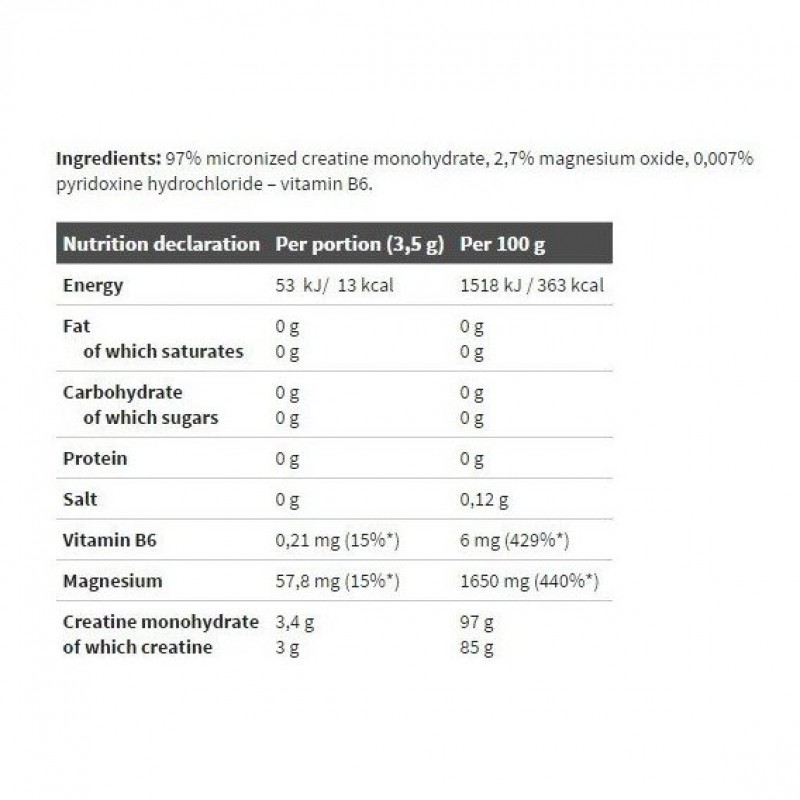 Основу препарата составляет креатин моногидрат. Его свойства уже давно известны и изучены. На сегодняшний день это самая стабильная форма креатина, к тому же — самая дешевая из всех представленных на рынке.