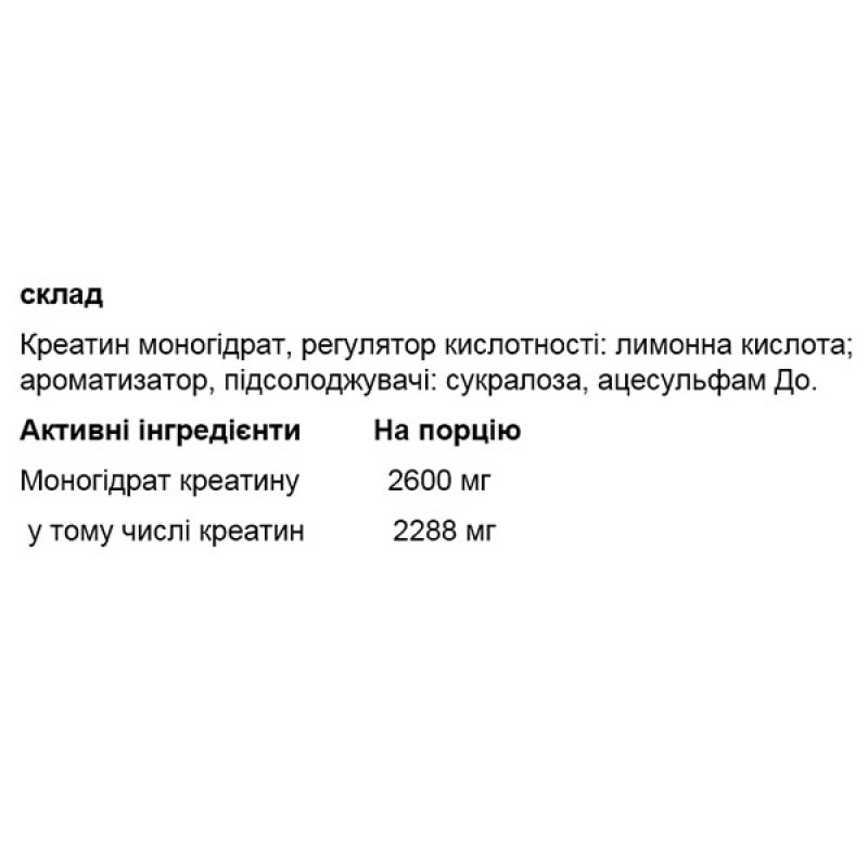 В продукте OstroVit употребляют моногидрат креатина, т.Е. соединение молекулы креатина с молекулой воды в одну молекулу – поскольку креатин является гидрофильным соединением, он легко соединяется с водой и поэтому является веществом с отличной биодоступностью. Моногидрат креатина является структурно простейшей формой креатина, а также наиболее популярным среди спортсменов соединением – он идеально подходит как для начинающих спортсменов, которые занимаются активным образом жизни, так и для профессионалов, благодаря тому, что креатин повышает физическую работоспособность при последовательных коротких и очень интенсивных тренировках. 3 г креатина.