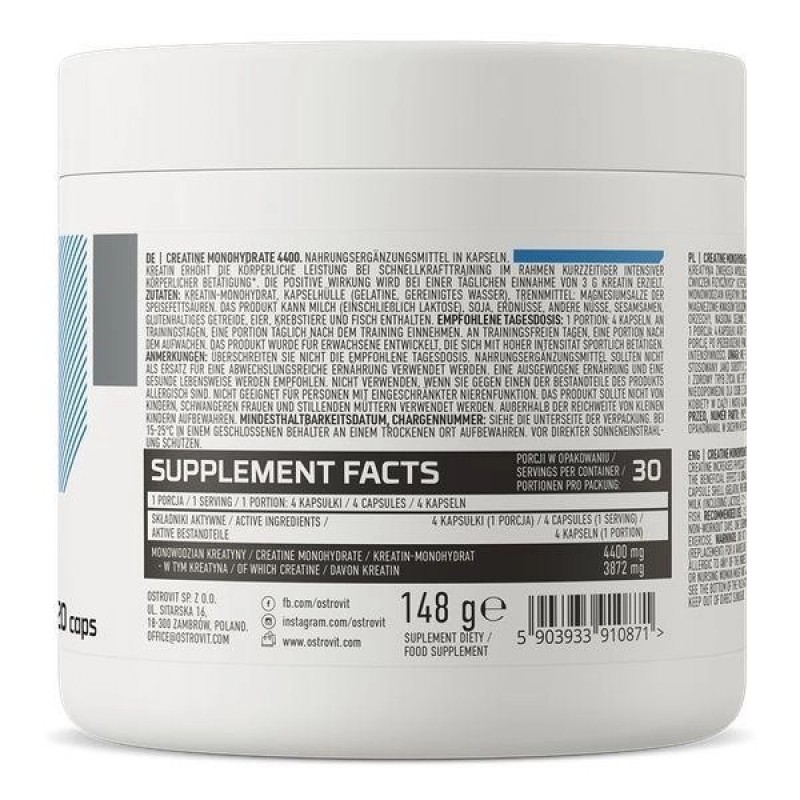 Одна порция (4 капсулы) содержит 4400 мг креатин моногидрата.