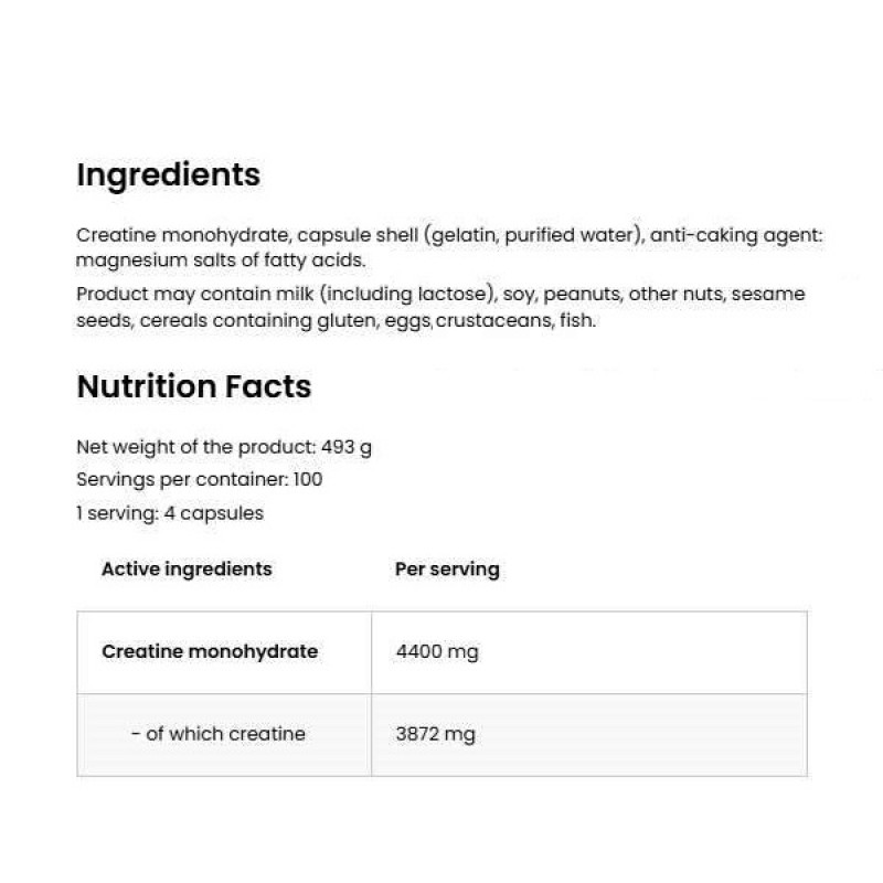 Одна порция (4 капсулы) содержит 4400 мг креатин моногидрата.