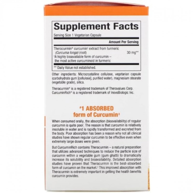 Однако CurcuminRich содержит теракурмин — натуральный препарат, который использует продвинутые методики для снижения размеров частиц куркумина в растительной камеди(камедь гхатти) для значительного повышения его растворимости и биодоступности. Подробные исследования доказали, что теракурмин является самой хорошо усваиваемой формой куркумина на рынке.‡ Эта повышенная усваиваемость, характерная для теракурмина, особенно важна для использования полезных свойств куркумина для здоровья.