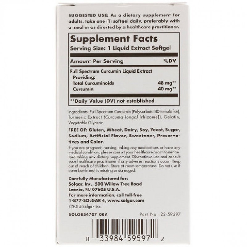 Куркумин – природный краситель, обладающий лечебными свойствами. Он способствует улучшению пищеварения, нормализует микрофлору кишечника, связывает свободные радикалы, противодействует возрастным болезням, эффективен как антибактериальное вещество, способствует детоксикации печени, препятствует формированию катаракты и формированию камней в желчном пузыре, улучшая его работу. Куркумин Full Sprectrum - это в 185 раз более доступная форма, чем обычный куркумин. Она превращает слабо усваиваемый куркумин из жирорастворимого в водорастворимый, делая его, более усваиваемым и активным. 40 мг куркумина в одной капсуле эквивалентно примерно 75 (100 мг) капсул стандартизированного экстракта куркумина. Более прочная и улучшенная форма с замедленным временем усвоения остается в организме дольше - в течение целых 24 часов. Куркумин способствует укреплению суставов, улучшению мозговой деятельности, укреплению иммунной системы.