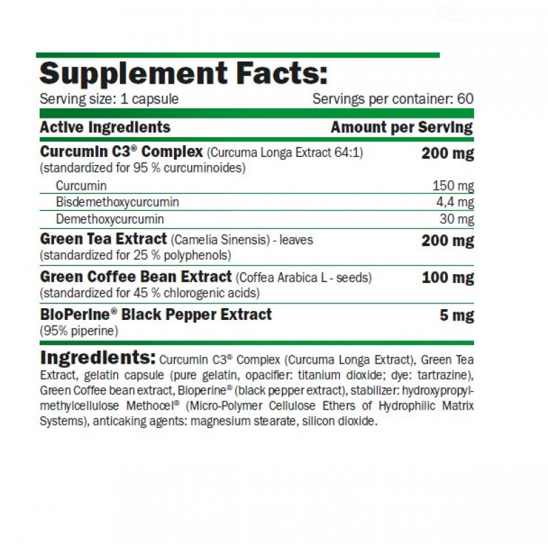 Amix Nutrition GreenDay® Curcum-IN Rapid – это запатентованная формула из трех куркуминоидов, обогащенная экстрактами зеленого чая и зеленых кофейных зерен. Также был добавлен BioPerine® для повышения биодоступности куркумина.
