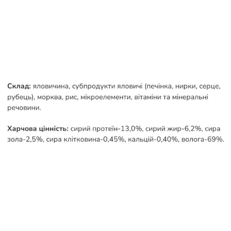 - Содержит говядину, овощи и злаки, которые являются отличными источниками белка, витаминов, минералов и углеводов