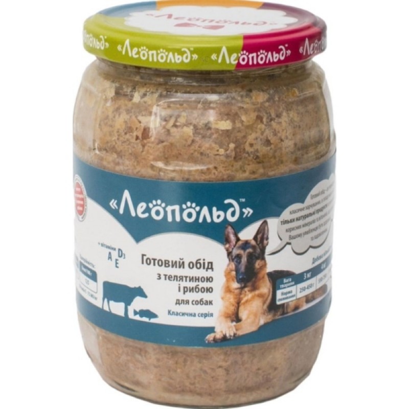 Леопольд Готовый обед с телятиной и рыбой для собак. Стеклянная банка 670 г (6 шт/уп)