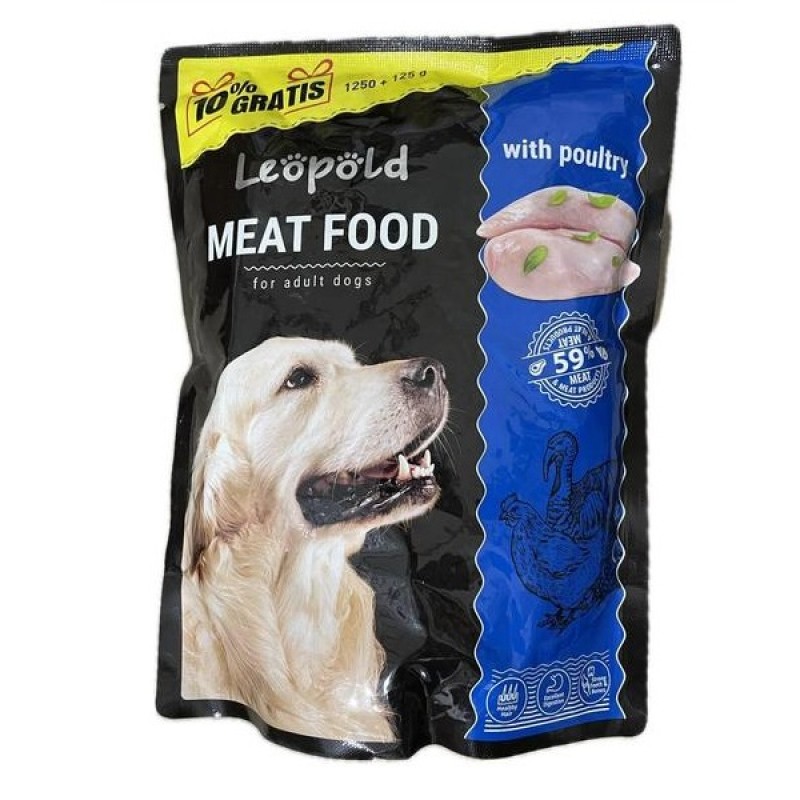 Влажный корм для собак Леопольд на 59% состоит из мяса и мясных продуктов. Корм изготовлен только из натуральных ингредиентов высокого качества.