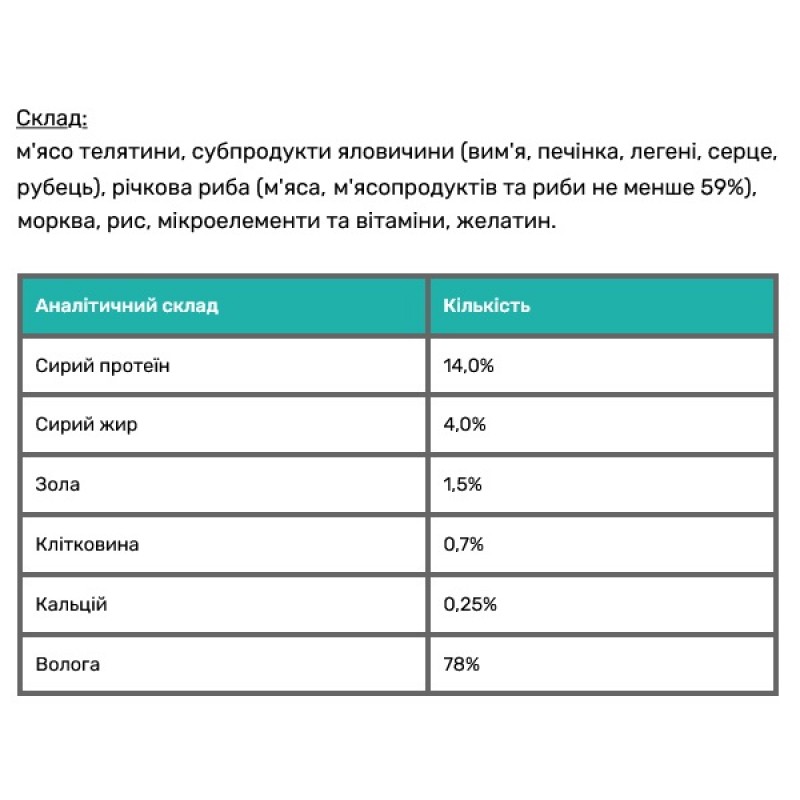 Мясной корм в соусе с телятиной и рыбой с овощами для котов - сбалансированный корм для полноценного питания домашних любимцев. Большое количество белка, которая содержится в мясной составляющей, и достаточное количество жира обогащают организм животного, предоставляют ей силы и активности в течение целого дня. Натуральный корм в консервированном виде для Вашего любимца не содержит красителей, ароматизаторов и сои, изготовленный только из натурального мяса и мясопродуктов. Готов для употребления без дополнительных усилий. Рекомендуется подавать к употреблению корм за температуры не ниже от комнатной.