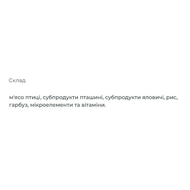 Белок, содержащийся в мясной составляющей корма и необходимое содержание жира обогащают организм животного, придают ему силы и активности в течение целого дня. Натуральный корм в консервированном виде для Вашего любимца не содержит красителей, ароматизаторов и сои, изготовлен только из натурального мяса и мясо-продуктов.