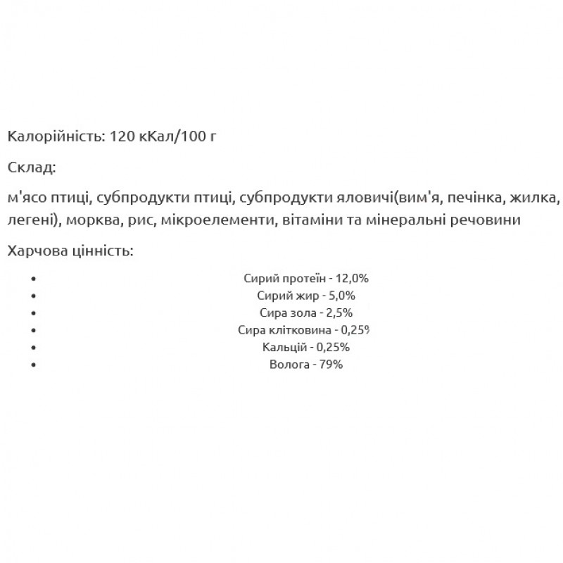 Мясные деликатесы с птицей для котов - сбалансированный корм премиум серии для полноценного питания домашних любимцев. Большое количество белка, которая содержится в мясной составляющей, и достаточное количество жира обогащают организм животного, предоставляют ему силы и активности в течение целого дня. Натуральный корм в консервированном виде для Вашего любимца не содержит красителей, ароматизаторов и сои, изготовленный только из натурального мяса и мясных продуктов. Готов для потребления без дополнительных усилий. Рекомендовано подавать корм к употреблению при температуре не ниже от комнатной.