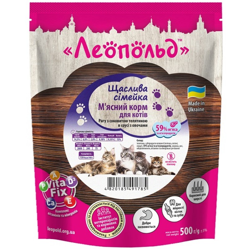 Сбалансированный влажный корм для кошек Леопольд Мясной корм для полноценного питания домашних любимцев. Вкусное рагу из кусочков телятины и овощей, приготовленных в нежном соусе, станет любимой пищей кошки. Консервы Леопольд на 59% состоят из мяса и мясных продуктов. Корм изготовлен только из натуральных ингредиентов высокого качества. Большое количество белка (14%), содержащегося в мясной составляющей, и достаточное количество жира (5%) обогащают организм животного, придают ему силы и активности в течение целого дня. Натуральный корм для кошек от украинского производителя Леопольд в консервированном виде не содержит красителей, ароматизаторов, сои, консервантов усилителей вкуса.