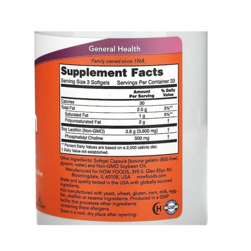 NOW содержат фосфатидил холин, который содержится в большей части нашего мозга и нервной системы. Лецитин также содержит натуральные жирные кислоты и инозитол. Лецитин помогает эмульгировать жиры, благодаря чему они растворяются в воде.