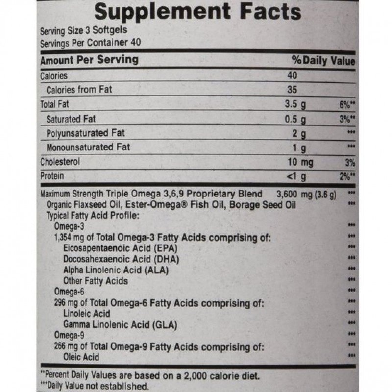 - Maximum Strength Triple Omega 3,6,9 запатентованная смесь — 3,600 мг (3,6 г):
