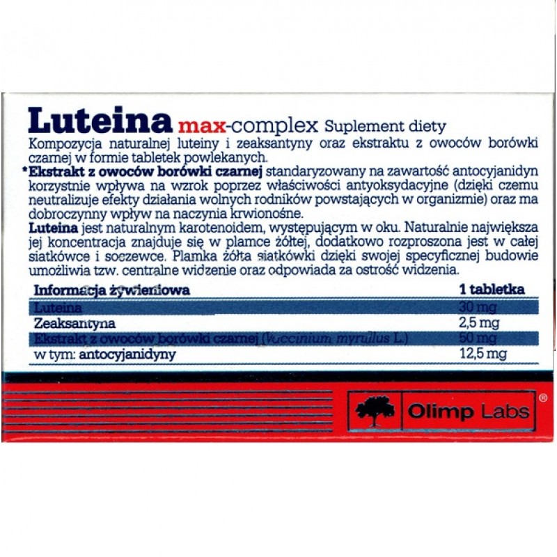 Olimp Luteina max-complex - это пищевая добавка, содержащая композицию натурального лютеина, зеаксантина и экстракт плодов черники. Рекомендован для взрослых людей, которые заботятся о своем зрении; особенно рекомендуется людям, которые работают при искусственном освещении, офисной работе за компьютером, которые чувствуют усталость глаз, а также людям среднего и преклонных лет.