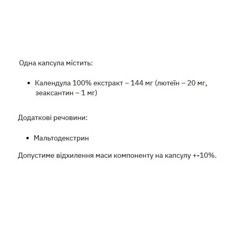 Дополнительные вещества: мальтодекстрин. Допустимое отклонение массы компонента на капсулу + -10%.