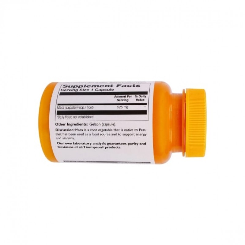 Мака (Мака перуанская) это однолетнее растение, которое выращивают в центральной части Перу на высокогорных плато на высоте 4000 метров над уровнем моря. Мака от компании Thompson производится в виде капсул. В состав продукции входят аминокислоты, фитонутриенты, витамины и минералы. Мака повышает силу, выносливость, а также помогает урегулировать и поддерживать гормональный баланс как у женщин, так и у мужчин.