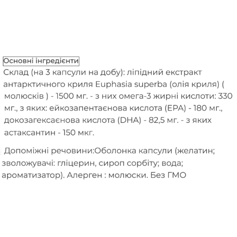 OMEGA 3 KRILL - добавка диетическая на основе масла криля, содержит большое количество омега 3 кислот и астаксантин. Рекомендуется принимать как средство, способствующее нормальной работе сердца. Также поддерживает функционирование мозга и нормальное зрение.