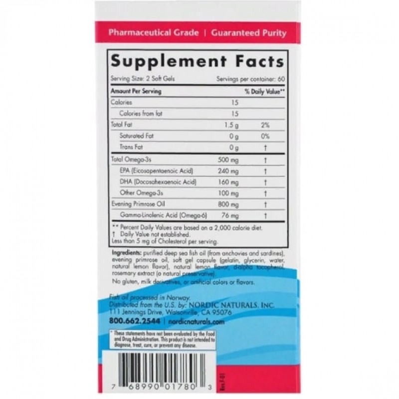 Очищенный жир глубоководных рыб (анчоусы и сардина), масло примулы вечерней (evening primrose), желатиновая капсула (желатин, глицерин, вода, натуральный ароматизатор «Лимон»), натуральный ароматизатор «Лимон», d-альфа-токоферол, экстракт розмарина (натуральный консервант).