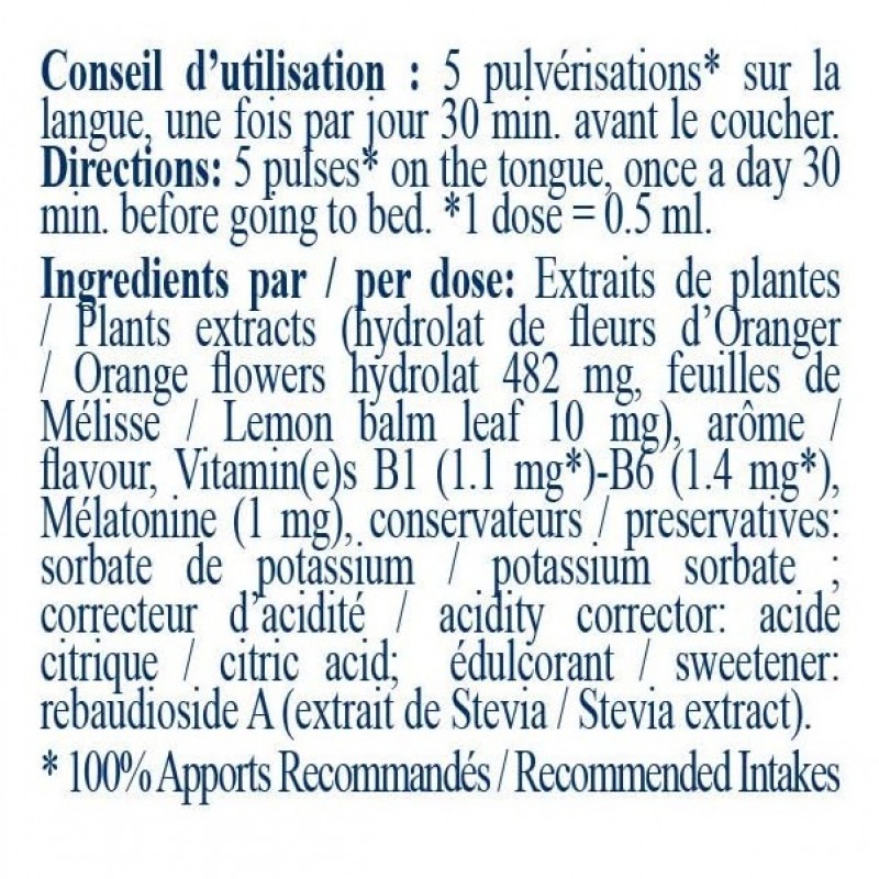 - Мелатонин 1 мг: Мелатонин представляет собой молекулу, которая помогает сократить время засыпания. Она быстро усваивается организмом, что обеспечивает быстрое действие средства Мелатонайт®. Этот быстрый эффект усиливается за счёт формы спрея, который распыляется непосредственно на язык, что позволяет максимизировать усвоение мелатонина. EFSA и многочисленные клинические исследования свидетельствуют об эффективности приёма мелатонина для сокращения времени засыпания и смягчения последствий смены часовых поясов. EFSA рекомендует, для преодоления расстройства суточного биоритма в связи с дальним перелётом, приём по крайней мере 0.5 мг / сутки мелатонина перед сном в 1й день и в течение нескольких последующих дней после прибытия в пункт назначения, а также рекомендует дозировку не менее 1 мг / сутки мелатонина перед сном для повышения качества сна. Эффект ощущается сразу, с первого для приёма.