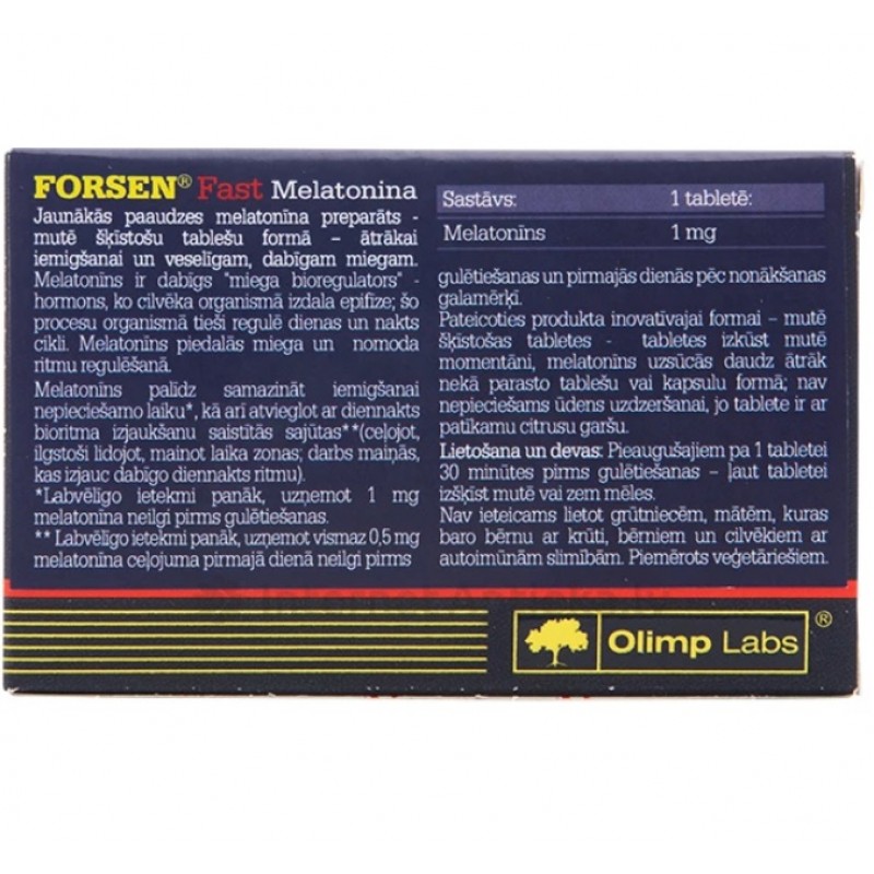 Forsen от Olimp – высокоэффективная спортивная добавка, созданная для нормализации сна. Изготовлен препарат на основе натуральных компонентов, действие которых усилено витаминами, макроэлементами и аминокислотами. Прием комплекса дает возможность расслабиться, побороть усталость и напряжение после тяжелого дня и интенсивной тренировки. Комплекс способствует хорошему отдыху и сну, что является залогом отменного здоровья и хорошего самочувствия, а также позволяет сформировать качественную мускулатуру.