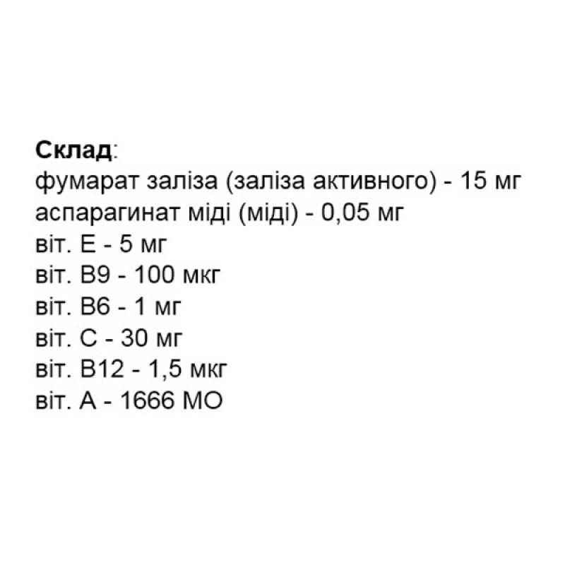 Чтобы повысить усвоение железа, состав препарата Железо Активное сбалансирован добавками меди в органической форме, витаминов А, С и комплексом витаминов группы В.